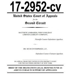 The Dramatists Legal Defense Fund commissioned me, as its Of Counsel, to draft an Amicus Curiae Brief for the United States Court of Appeals in the Second Circuit in the matter of Lombardo et al. v. Dr. Seuss Enterprises, L.P.